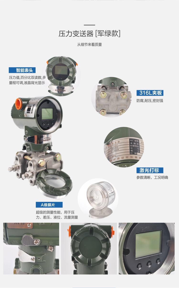單晶硅壓力/差壓變送器(MonocrystallineSiliconPressureTransmitter)用于測量液體、氣體或蒸汽的液位、密度、壓力,然后將其轉變成4-20mAHART電流信號輸出,也可與HART375或BST Modem相互通信,通過他們進行參數(shù)設定、過程控制。與傳統(tǒng)壓力變送器的區(qū)別在于它使用的是納米單晶硅作為傳感器材料。