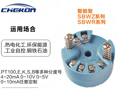 現(xiàn)場安裝在熱電偶、熱電阻的接線盒內(nèi)使用,直接輸出4-20mA、0-10mA的輸出信號。這樣既節(jié)約了昂貴的補(bǔ)償導(dǎo)線費用,又提高了信號遠(yuǎn)距離傳輸過程中的抗干擾能力;